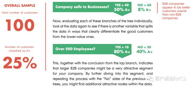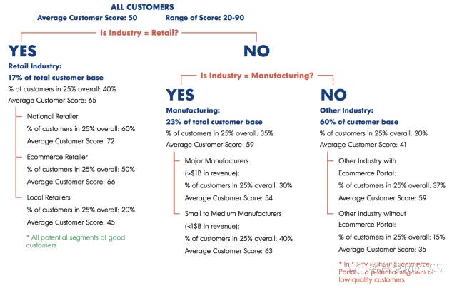 通过多轮分析之后,可以把分群的假设转化成树形模式,如下图,可以清楚的看到客户都分布在哪里。