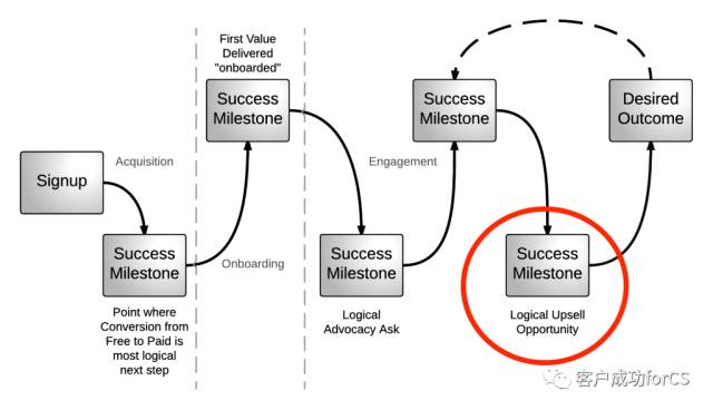 如下图,在客户通向成功的里程碑中,便可以合理的规划扩展销售的机会。可以通过数据或者系统,帮助或者直接提示客户成功经理或者专属扩展销售人员,在客户达到了相应的成功里程碑之后,主动出击引导客户购买更多相关产品和服务。