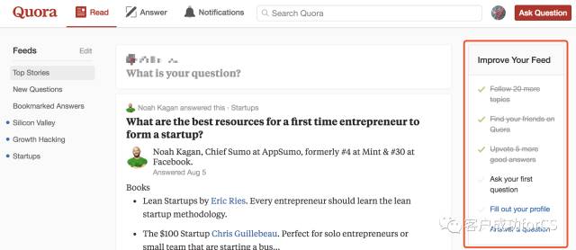 也并不是所有的流程都能无缝切入,所以还是需要一个引导流程,例如美国的知乎Quora,通过右侧简单的列表作为引导。